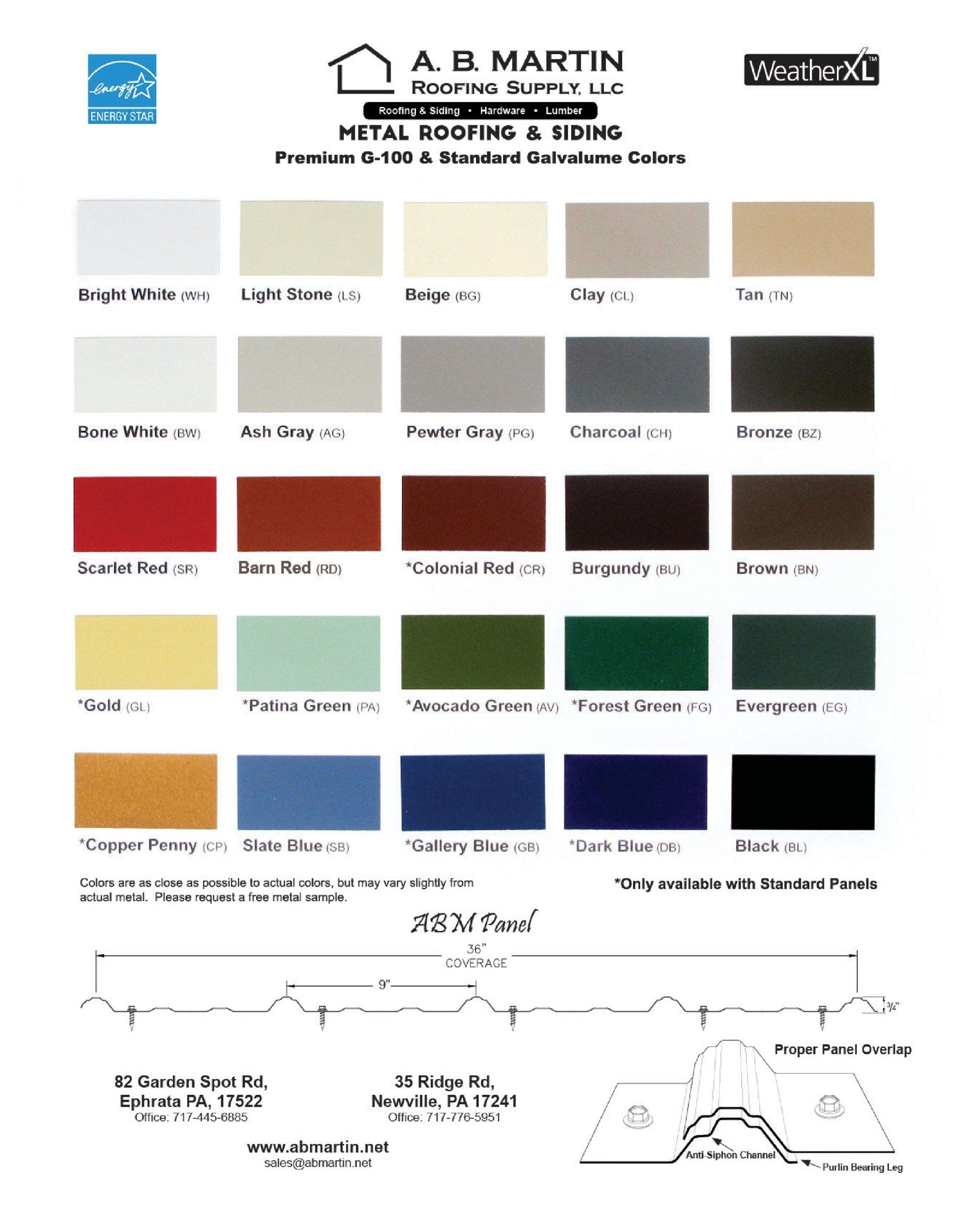 Below is a color chart with all the available color options. We use 28 Ga. G-100 painted steel ABM panels with a 40 year warranty. Painted steel is the most economical and durable siding and roofing available. We use only G-100 panels for our exterior steel. This number indicates the thickness of the zinc coating and directly affects the steel's resistance to corrosion.